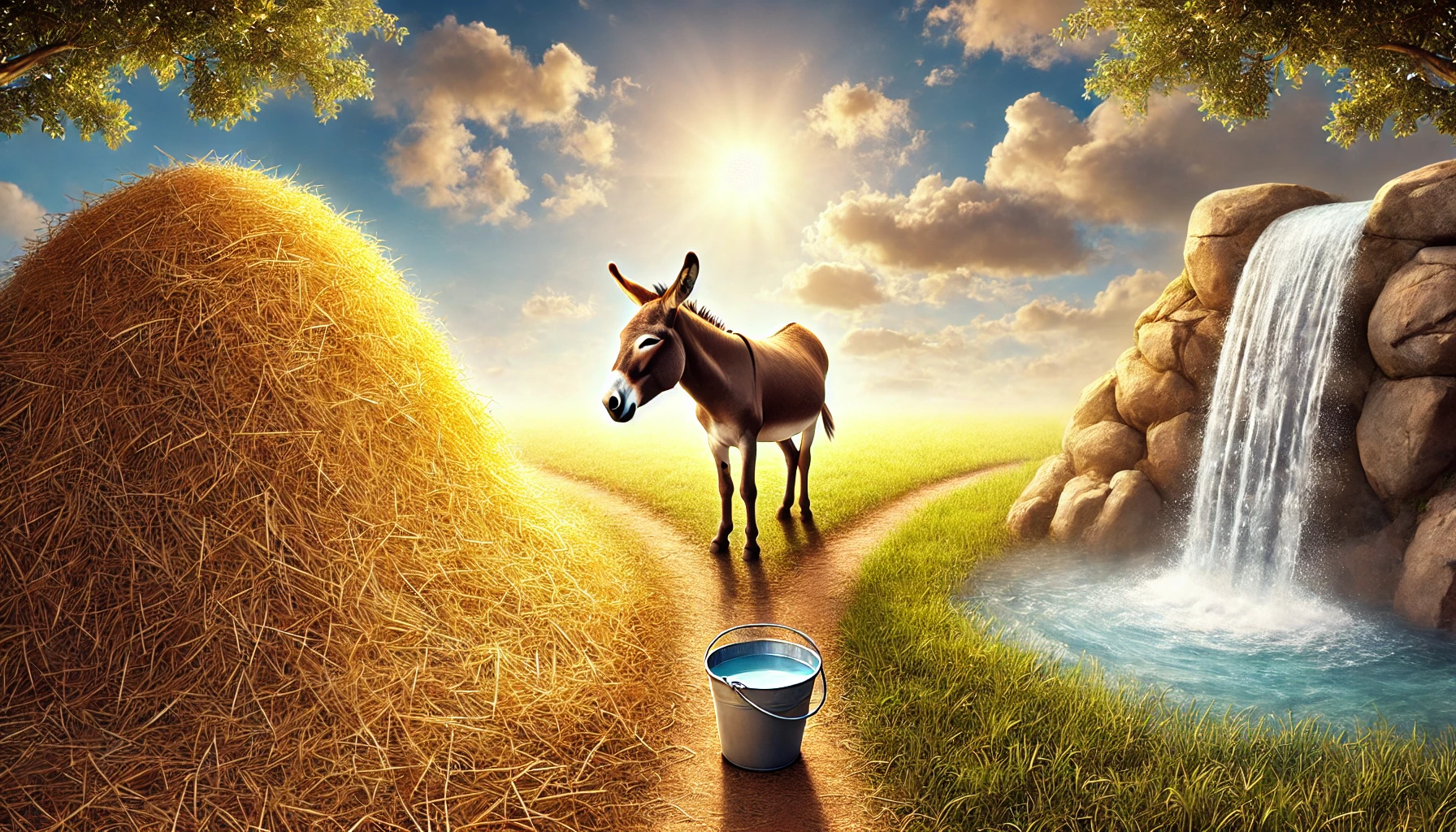 Imagine a cena: um burro exausto de fome e sede se encontra diante do dilema mais surreal de sua existência. À esquerda, um monte de feno dourado, irresistível. À direita, um balde de água límpida e refrescante. Ele está exatamente no meio dos dois, sem conseguir decidir o que deve priorizar. Seu estômago ronca, sua garganta queima de sede, e sua mente… Bem, sua mente está completamente paralisada.